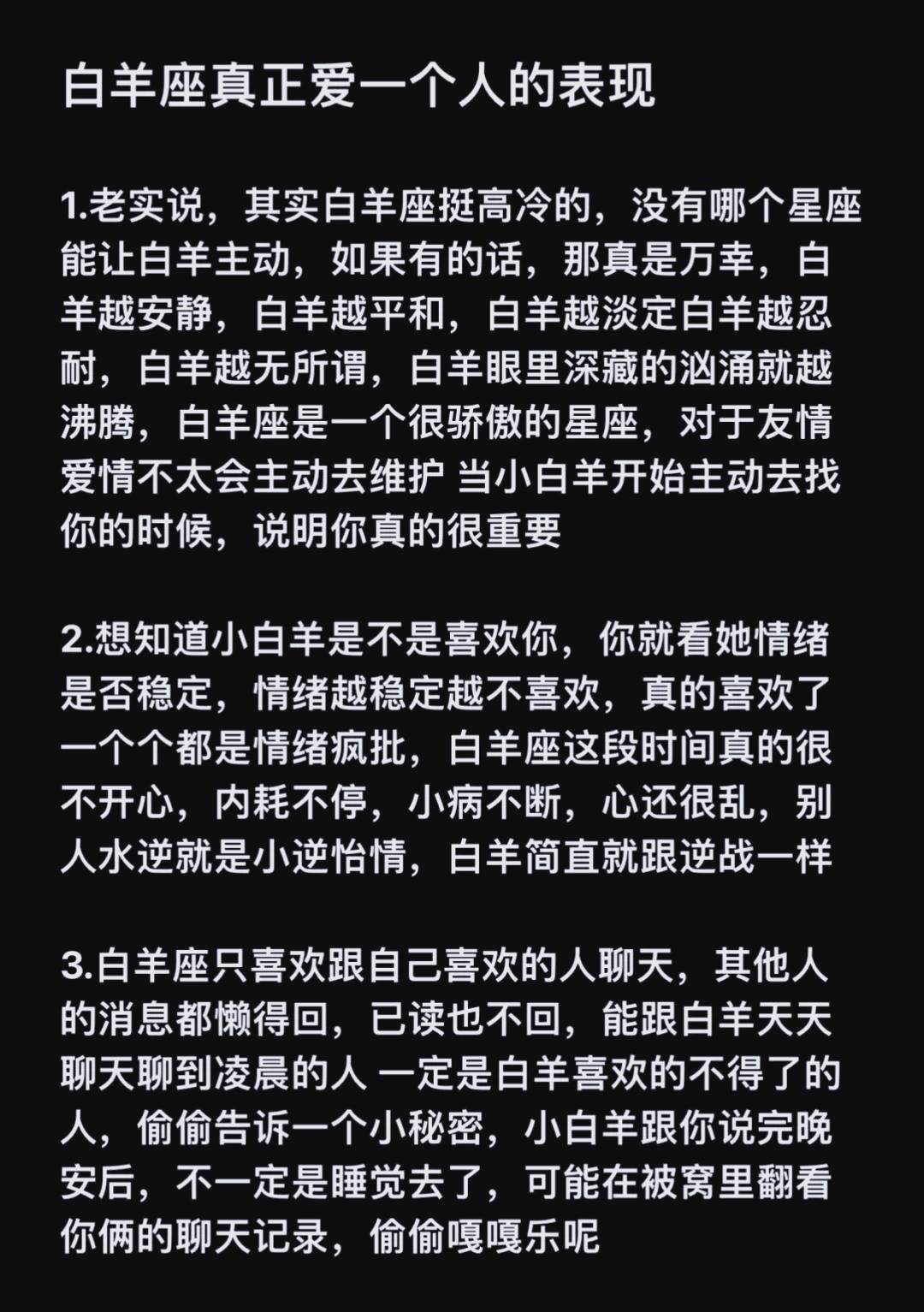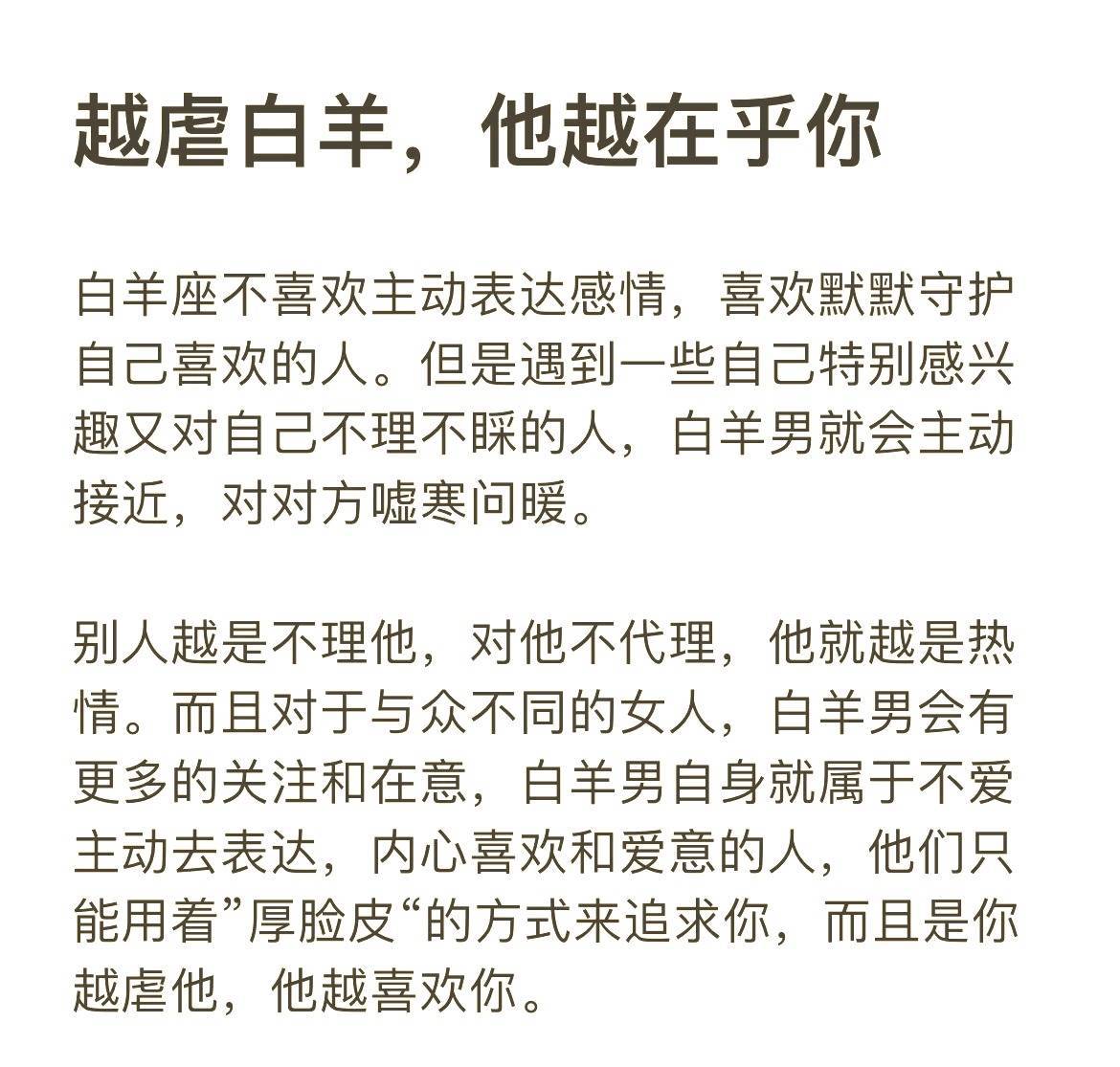白羊座的爱情就像夏天的雷阵雨,来得又快又猛——上一秒还在朋友聚会上和你插科打诨,下一秒可能就捧着玫瑰站在你家楼下。这种被火星守护的冲动特质,常让他们在感情里被贴上“鲁莽”标签,但那些看似冲动的行为背后,藏着最直白的真心。就像星座专栏里说的,当白羊座开始在意一个人,敏感指数会直线上升,连吃醋都像小孩子讨糖吃,非要你明确说“最在乎的是TA”才肯罢休。  第一个藏不住真心的行为,是他们像“爱情闪电侠”般的行动力。上周闺蜜的白羊男友就是典型:两人刚确定关系三天,他直接请年假订了去海边的机票,理由是“想和你看第一缕日出”。这种“3秒决策”的冲动,在星盘解读里被称为“火星能量的直接投射”——他们不是没想后果,只是比起权衡利弊,更怕错过当下的心动。就像有篇星座分析写的,白羊的冲动从来不是盲目的,那是他们“把喜欢翻译成行动”的独特方式。  第二个暴露真心的信号,是突然变得“小气”的占有欲。平时和朋友吃饭抢着买单的白羊座,恋爱后可能会因为你回复消息慢了半小时而闹别扭。同事的白羊女友曾因为她夸了句“隔壁工位男生新发型不错”,当场把她的奶茶换成全糖——这种幼稚的醋意,在占星学里被解读为“火象星座的领地意识”。他们像守护宝藏的小兽,越在乎就越想把你圈在自己的安全区,那些看似无理取闹的计较,其实是在说“你对我很重要”。  最戳人的还是第三个行为:吵架后的“反向道歉”。白羊座从不记仇,但拉不下脸直接说软话。朋友的白羊老公每次吵完架,都会默默做些笨拙的补偿——偷偷把她爱吃的草莓洗好放在床头,或者假装顺路买她最爱的奶茶。这种“嘴硬心软”的冲动,就像星座文章里说的:“他们的道歉从来不是语言,而是行动上的‘我不能没有你’”。  其实白羊座的冲动从来不是缺点,而是他们爱得纯粹的证明。就像那位把即兴约会变成“年度浪漫计划”的白羊设计师,他们总能用最热烈的方式告诉你:爱情里最珍贵的,或许就是这份不掺杂质的“冲动真心”。毕竟在这个权衡利弊的时代,还有人愿意为你不管不顾地奔赴,本身就是最动人的告白。