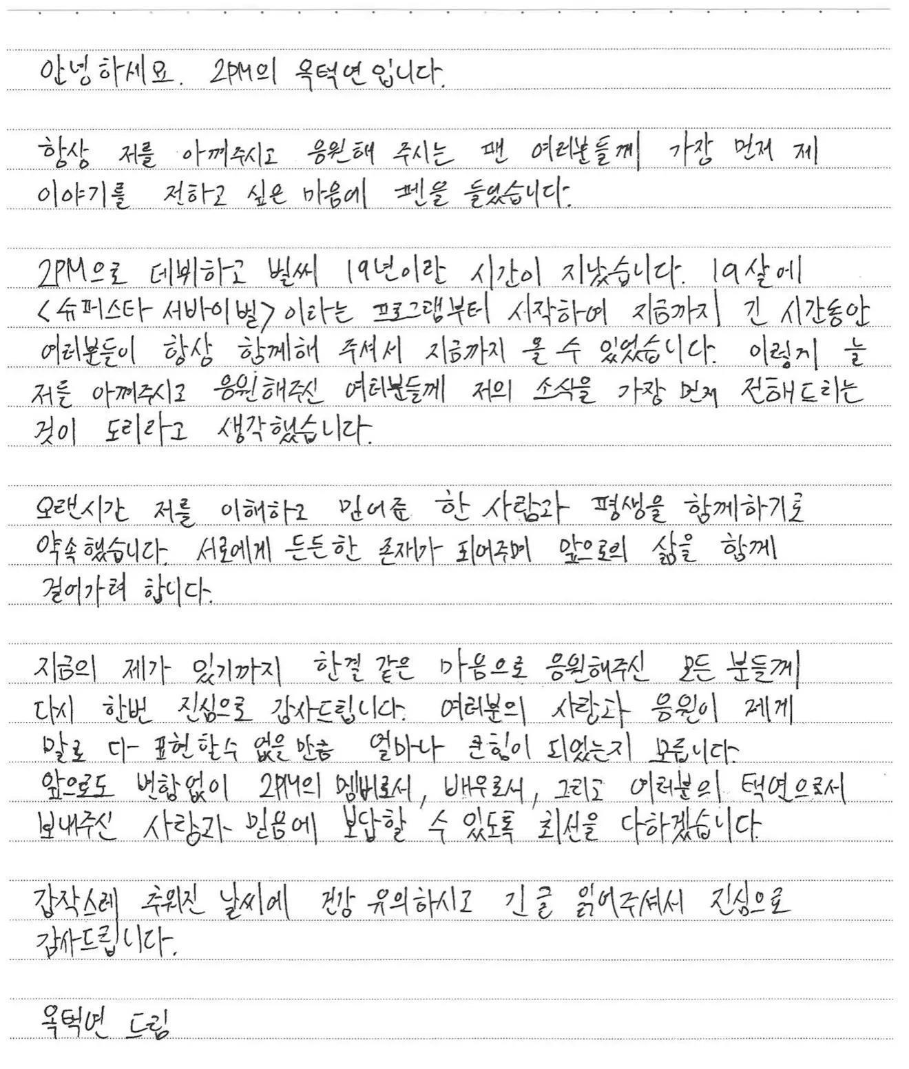玉泽演在韩国演艺圈一直有着“模范男友”的称号,他和这位圈外女友已经稳定交往了很长时间,平时还会大方带着女友在街上散步,毫不避讳公开恋情。之前他求婚成功的消息传开后,不少粉丝就猜到好事将近。而这封亲笔信里,他只用一个段落提到了结婚的事,其余内容全是对粉丝的感谢,能看出他十分在意粉丝的心情。
