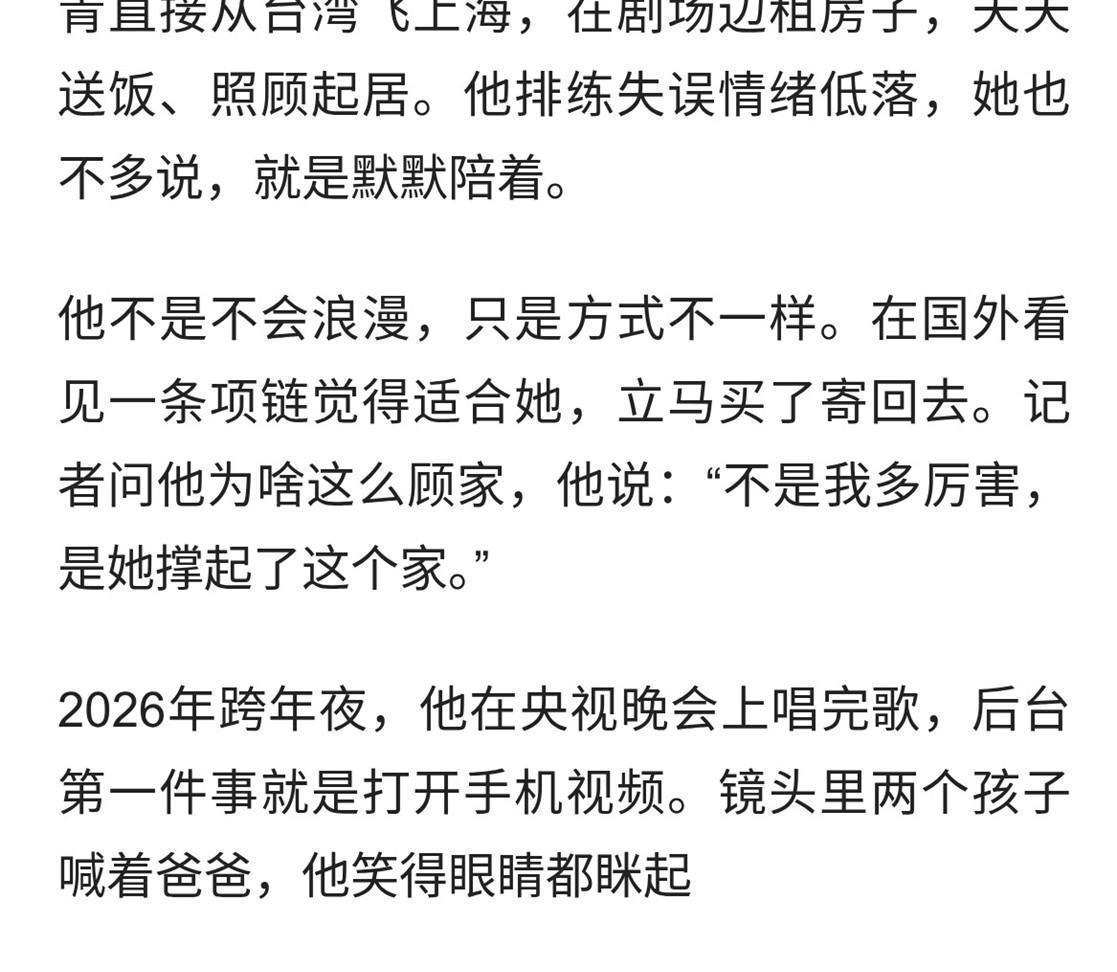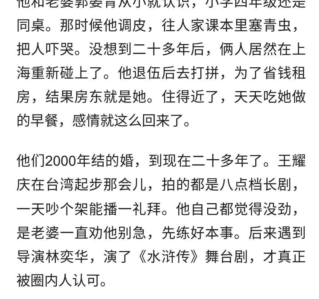 王耀庆演戏这条路能走成现在这样,他太太郭晏青起了大作用。那时候家里人都不同意,她还是嫁过去了,在台湾那边生活。后来两个儿子基本都是她一个人带起来的,家里的事不用王耀庆操心,他能专心在外面工作。网上有人讲过这么个意思,说王耀庆的例子摆在那儿,找个能一起过日子的伴侣,比琢磨别的都实在。话是说得直白了点,但意思大家都明白——男人在外头做事,家里总得有个能稳住的人。